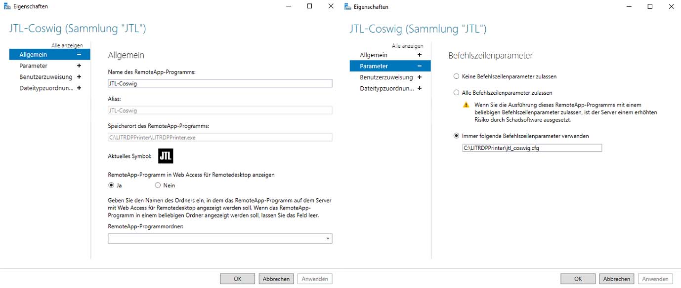 import-module RemoteDesktop $SERVER="REMOTEDESKTOPSERVER" $USER="DOMÄNE\BENUTZER","DOMÄNE\Domänen-Admins" New-RDRemoteApp -collectionname JTL -Alias JTL-Coswig -DisplayName JTL-Coswig -FilePath "C:\LITRDPPrinter\LITRDPPrinter.exe" -IconPath "C:\LITRDPPrinter\JTLwawi.ico" -RequiredCommandLine "C:\LITRDPPrinter\jtl_coswig.cfg" -CommandLineSetting Require -ShowInWebAccess 1 -ConnectionBroker $SERVER -UserGroups @($USER)